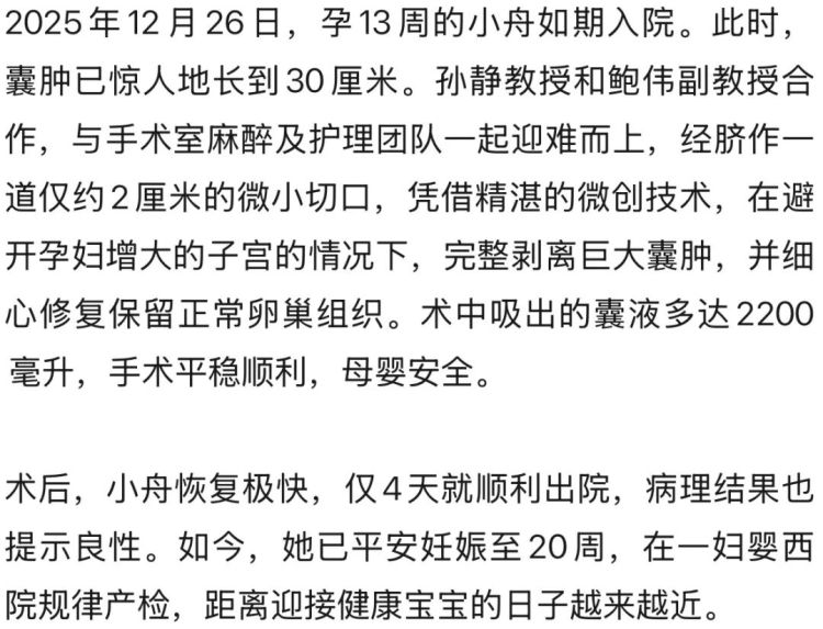2023年,小舟曾因卵巢囊肿接受手术,本以为已平安度过,谁知囊肿悄然复发。2025年9月,当她欣喜发现自己怀孕时,噩梦再次降临——那颗原本仅4厘米的囊肿,竟在孕期激素的刺激下疯狂生长,短短数月就长到22厘米,腹部急剧膨隆、腹胀难忍,随时可能发生扭转、破裂,威胁胎儿与母体安全。